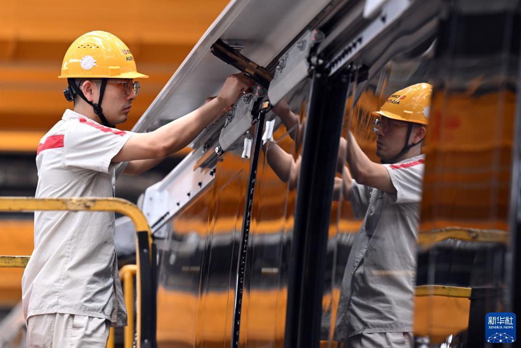 9月13日,在位于安徽芜湖的中车浦镇阿尔斯通运输系统有限公司内,工作人员进行单轨车辆门机构安装。