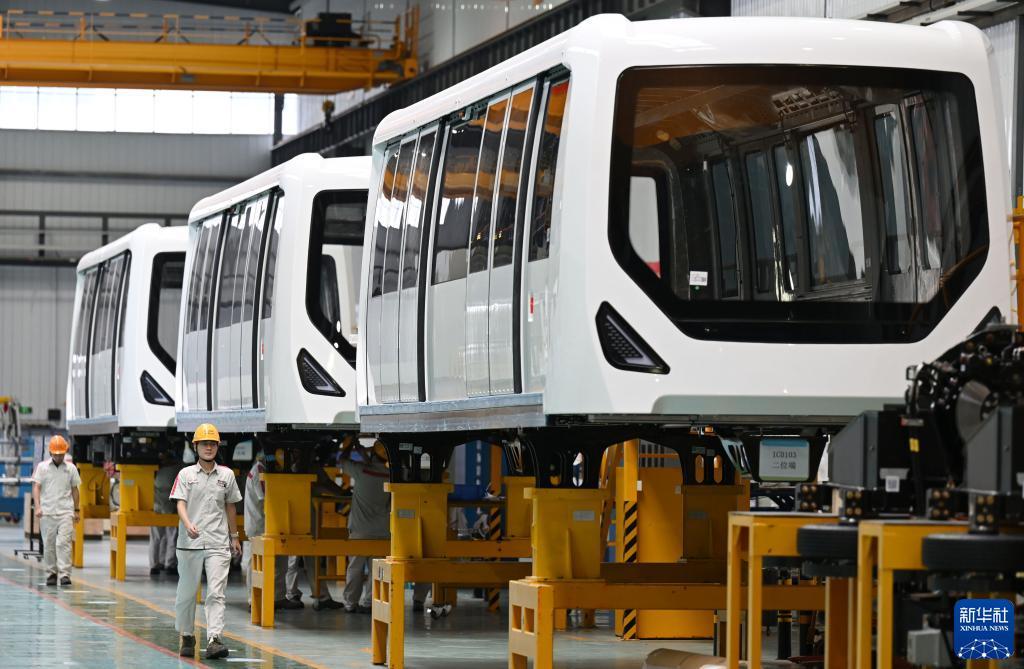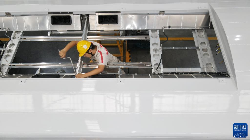 9月13日,在位于安徽芜湖的中车浦镇阿尔斯通运输系统有限公司内,工作人员进行单轨车辆细水雾管路安装(无人机照片)。