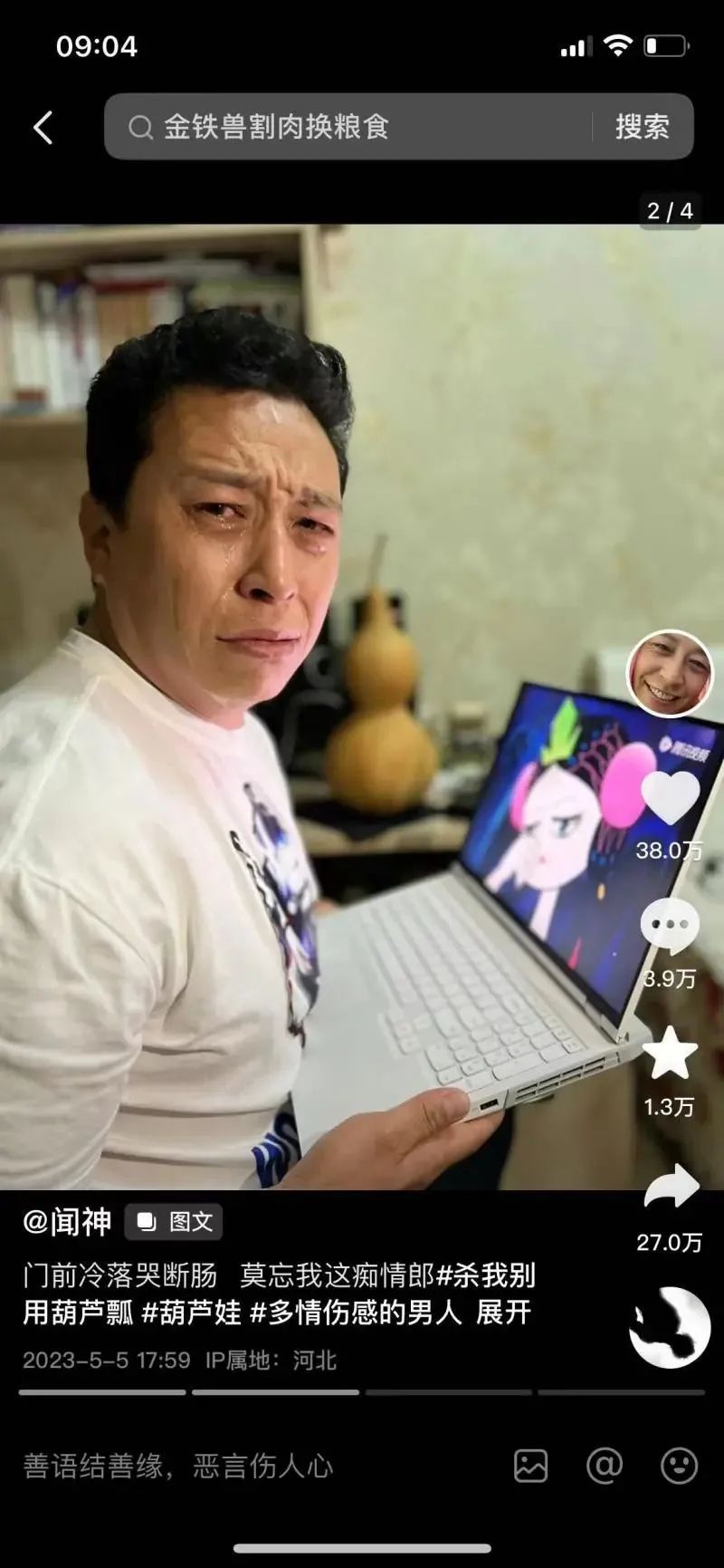 今年5月,他在“闻神”账号发布了第八条抖音,四张搞笑图片和一条文案,获赞38万。