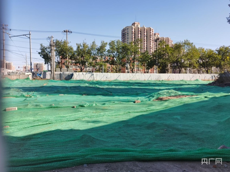 上述居民告诉央广网记者,换乘站在临泓路与南苑路路口西南角红绿灯路口处。在他的指引下,记者来到了换乘站建设位置,现场有一大片围挡,里面大片裸露的地面被盖上了绿网。“这围挡都围了3年了,说是地下通道也都建成了,就地面上一直没建。”一名居民介绍,这里原是苗圃西里1号楼和2号楼,因建设大红门站F口和换乘通道被拆迁。