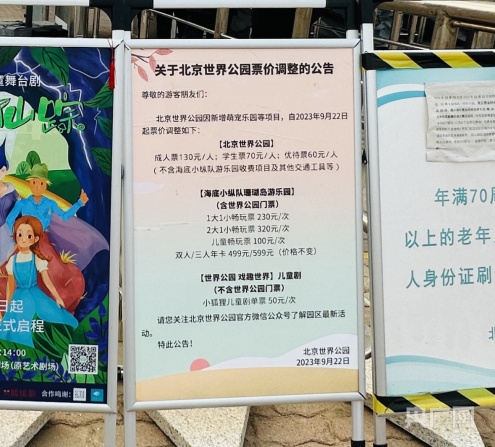 记者经查询了解到,世界公园历史上门票几乎未曾进行过降价。刚开园时门票为30至40元,2000年前后为65元左右,2010年前后约为80元,今年8月份为100元,9月22日起涨至130元。