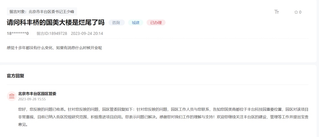 对此,“北京市丰台区园区管委”回复称,国美商都位于丰台科技园重要位置,园区对该项目非常重视,目前已纳入街区控规研究范围,积极推进项目启用。