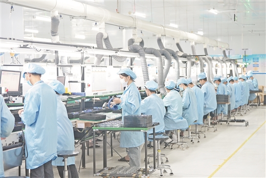 位于北海经开区的广西通力电子科技有限公司车间,产业工人在头戴耳机生产线作业。广西日报记者 覃鸿图/摄
