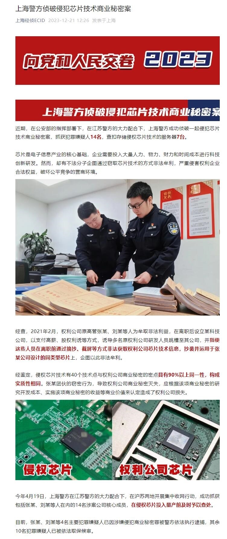12月21日,上海市公安局经济犯罪侦查总队公众号“上海经侦ECID”发布通报称,近期,在公安部的指挥部署下,在江苏警方的大力配合下,上海警方成功侦破一起侵犯芯片技术商业秘密案,抓获犯罪嫌疑人14名,查扣存储侵权芯片技术的服务器7台。