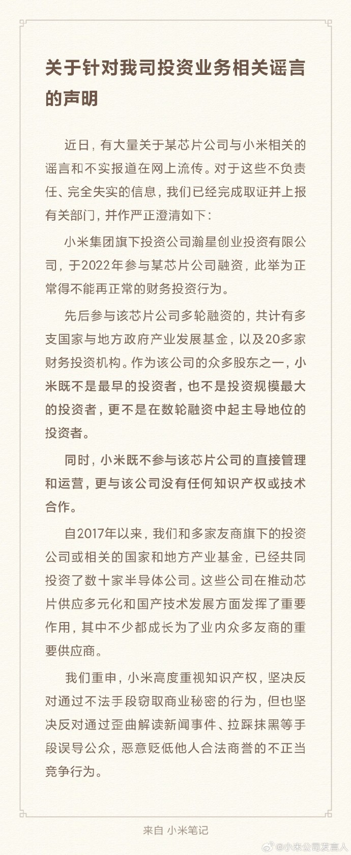 小米称,小米集团旗下投资公司瀚星创业投资有限公司,于2022年参与某芯片公司融资,此举为正常得不能再正常的财务投资行为。先后参与该芯片公司多轮融资的,共计有多支国家与地方政府产业发展基金,以及20多家财务投资机构。作为该公司的众多股东之一,小米既不是最早的投资者,也不是投资规模最大的投资者,更不是在数轮融资中起主导地位的投资者。小米既不参与该芯片公司的直接管理和运营,更与该公司没有任何知识产权或技术合作。