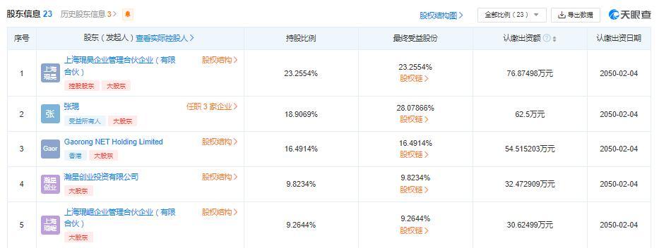 天眼查网站显示,尊湃通讯科技(南京)有限公司成立于2021年3月,注册资本330.567992万人民币,法定代表人为张琨。目前,该公司由上海琨昊企业管理合伙企业(有限合伙)(持股23.2554%)、张琨(持股18.9069%)、Gaorong NET Holding Limited(持股16.4914%)、瀚星创业投资有限公司(持股9.8234%)、上海琨崛企业管理合伙企业(有限合伙)(持股9.2644%)等23个股东共同持股。