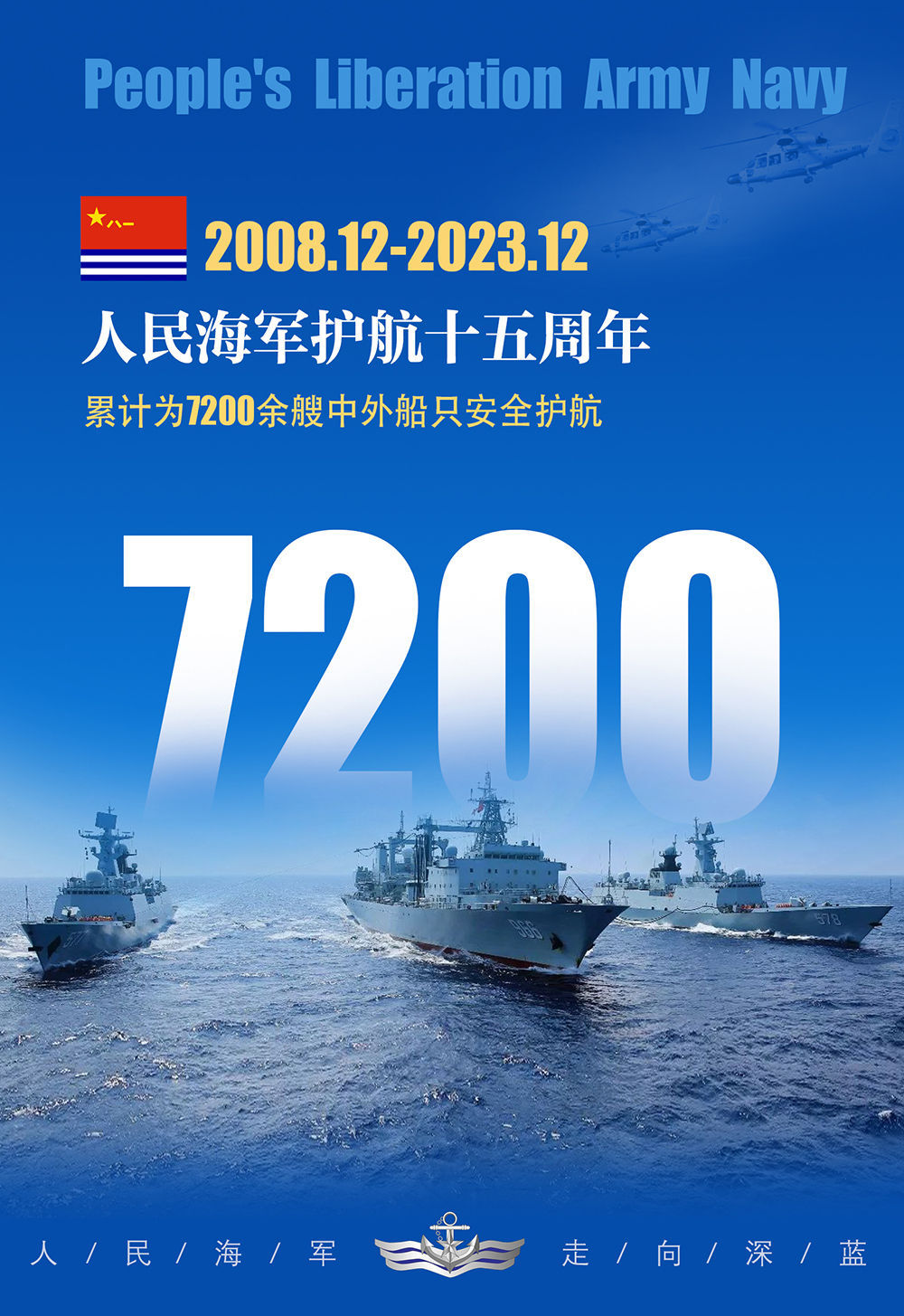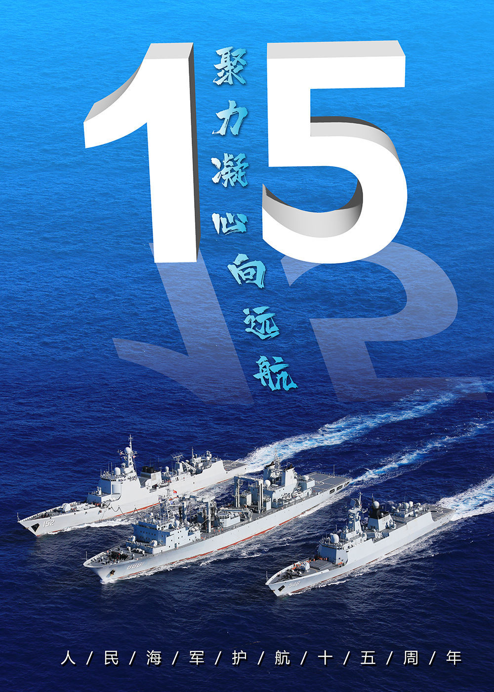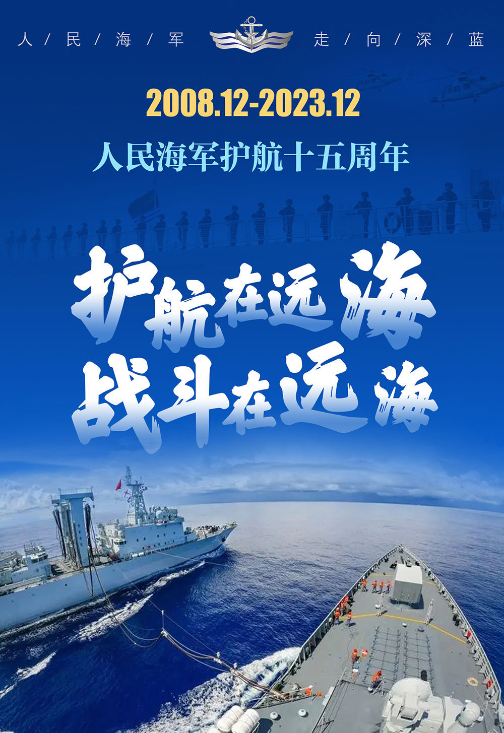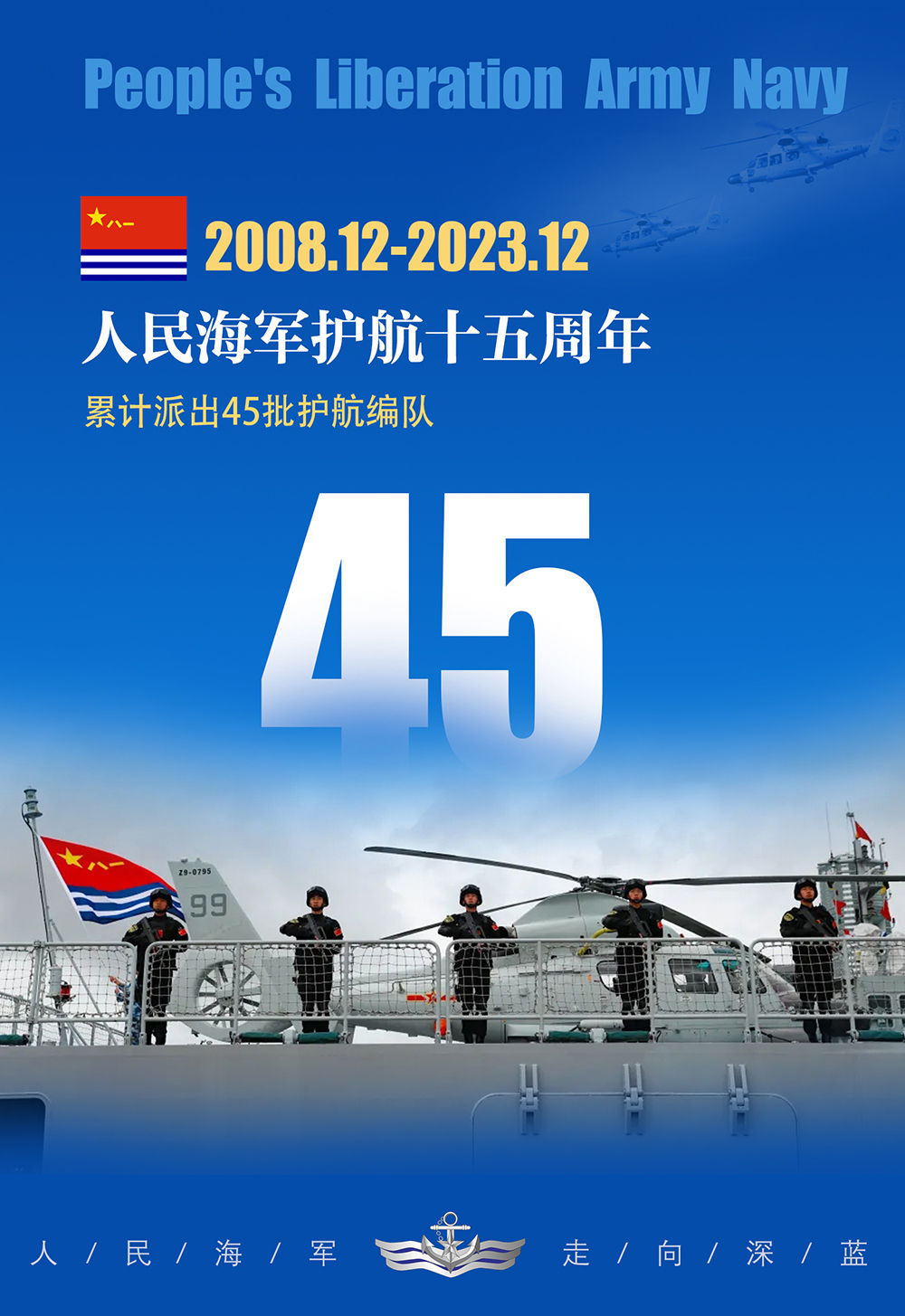 2008年12月26日,中国海军首次派出护航编队赴亚丁湾、索马里海域。15年来,中国海军已连续派出45批护航编队、150余艘次舰艇、3.5万余名官兵执行护航任务,累计安全护送包括12艘世界粮食计划署船舶在内的1600余批7200余艘中外船舶。