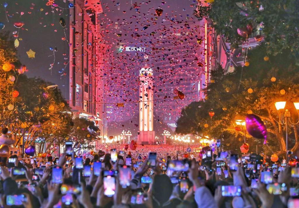2023年的最后一个夜晚,在重庆,人们纷纷涌入解放碑步行街,等待零点钟声敲响。“10、9、8、7……”新年到来前的最后10秒,人们齐声呐喊、放飞气球,让跨年气氛到达顶峰。