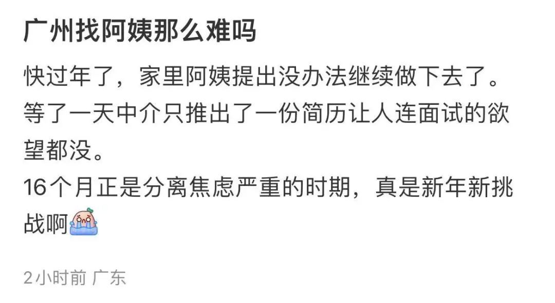 近期,上海张女士家中带宝宝的阿姨突然离职,但因为临近年末,家政人员非常紧缺,她联系了所有认识的家政公司也没能找到顶替的阿姨。无奈之下,张女士加入小区各种微信群找“共享阿姨”。