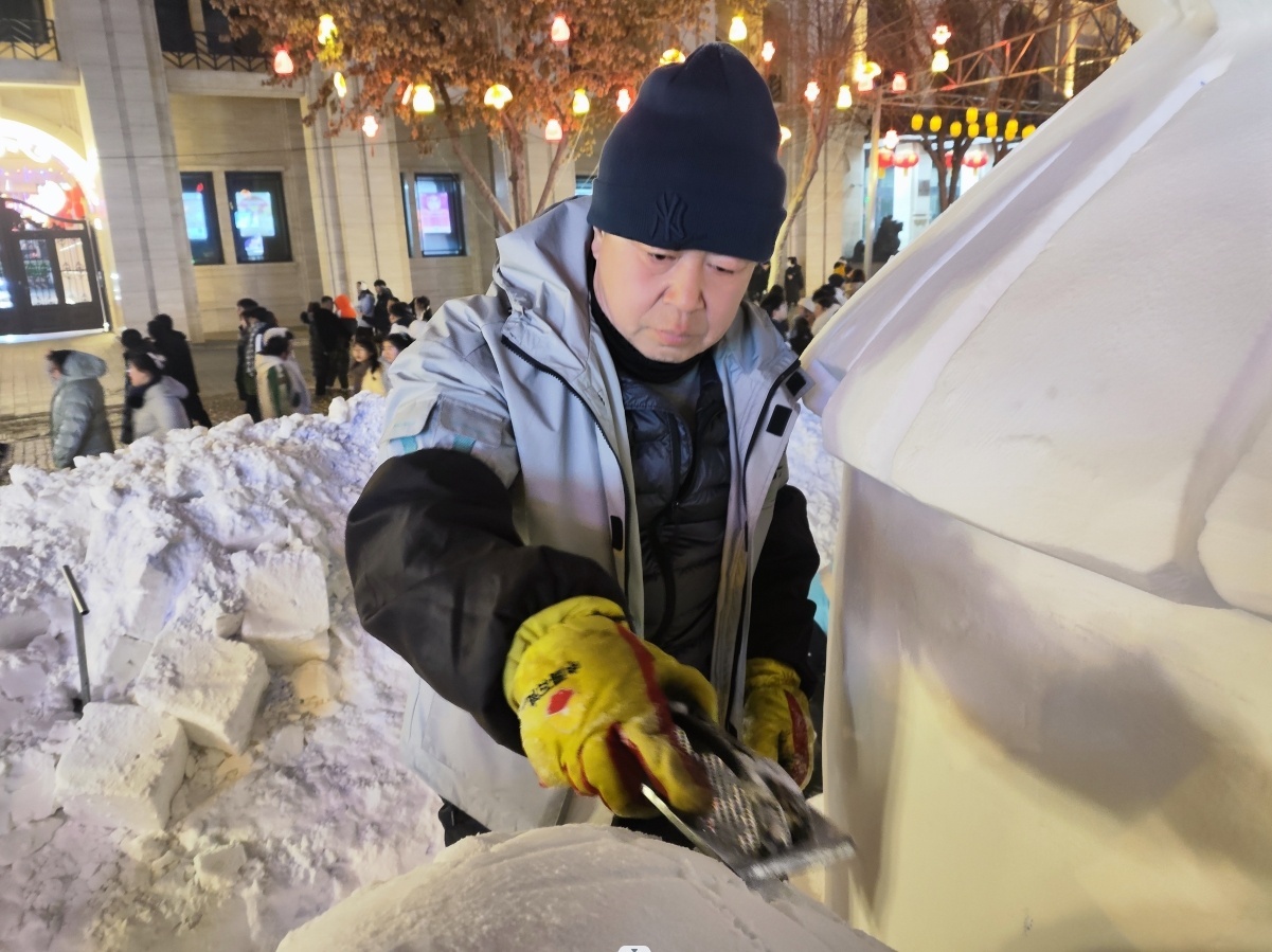 中央大街上,一间房大小的雪坯子到三米高的“五谷丰登”雪雕,从早上7点多一直到晚上9点多终于完工,包括臧洪洲在内的三位雕刻师傅忙活了十多个小时,除了午饭几乎没有休息,“比较细碎的雪渣,用铁锹清理不方便,就直接用手套和套袖一搂,一天下来,手套全湿了。”