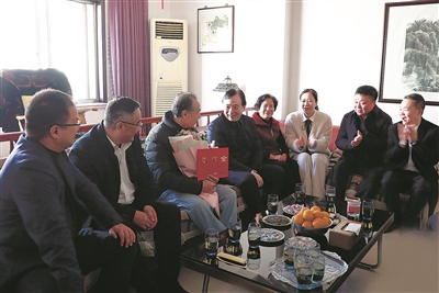 1月9日,刘忻(右五)在温州看望慰问全国先进工作者马品荣,并送上新年祝福。浙江工人日报记者邹伟锋 摄