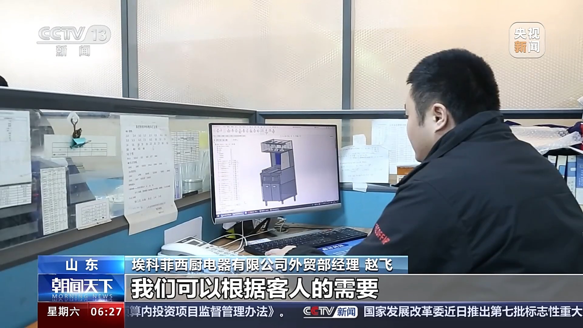 埃科菲西厨电器有限公司外贸部经理 赵飞:这个薯条工作机,是基于不同口味进行分隔存储,并要单独的控制控温,我们可以根据客人的需要进行适当地定制化。