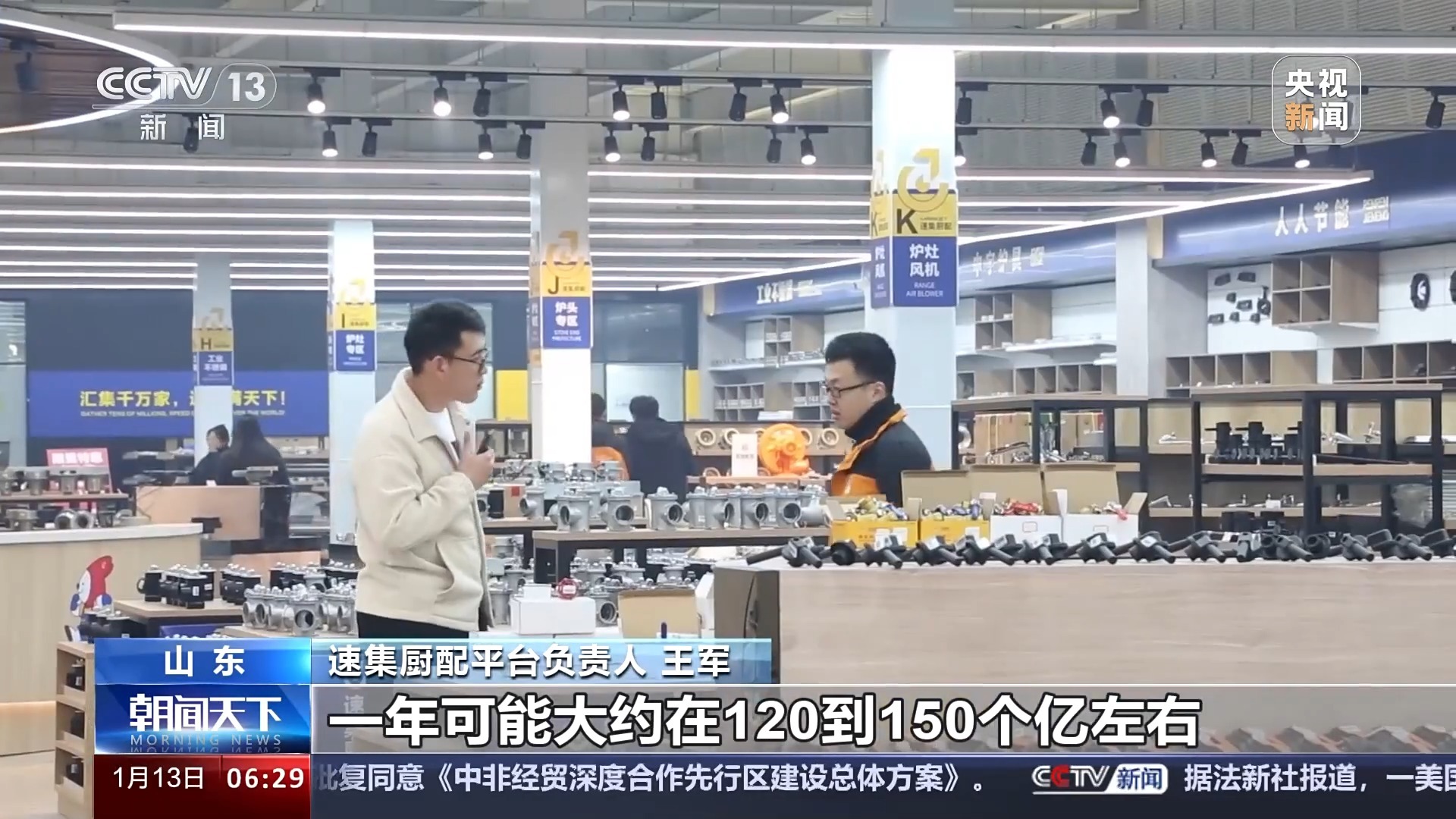 速集厨配平台负责人 王军:我们整个兴福镇的商用厨具配件的需求量,一年大约在120到150个亿左右,这么大的一个市场体量,到供应商那里我就有议价权了,为我们生产企业节省了成本。