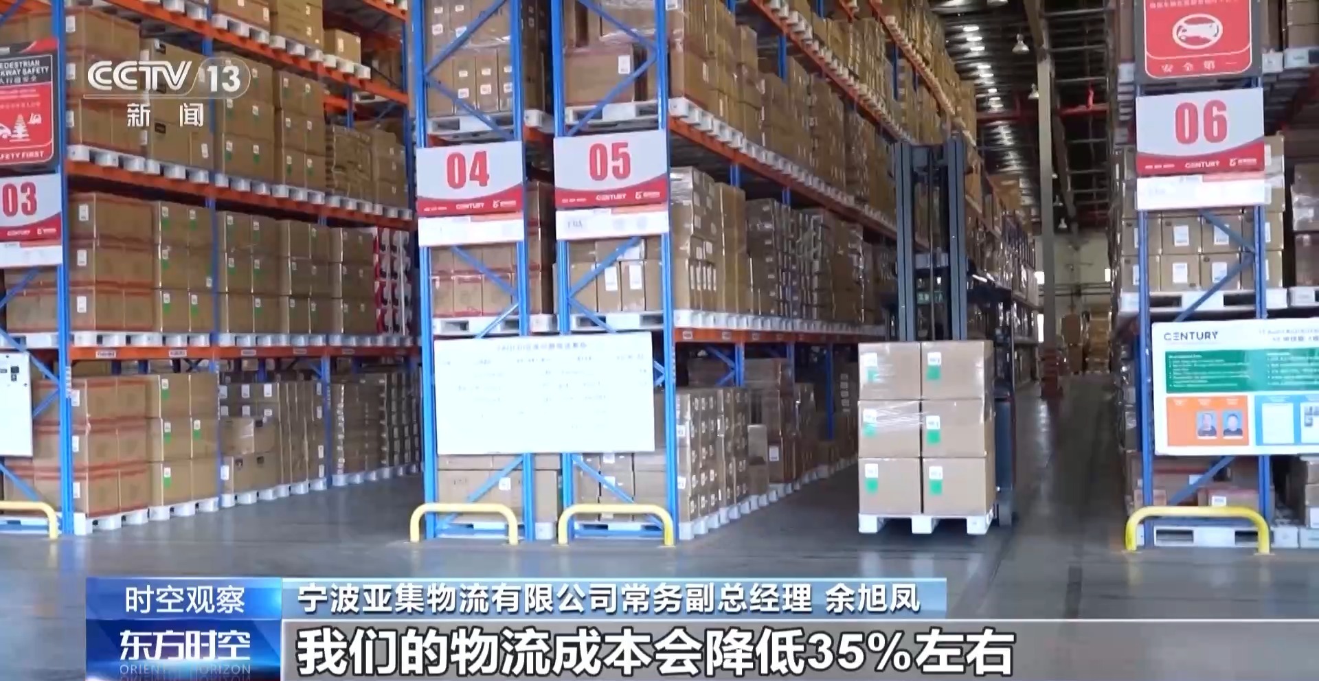 宁波亚集物流有限公司常务副总经理 余旭凤:时间上面,我们基本上就会减少1到2天的作业时间。从我们整体的仓库物流成本上来说,整体的物流时效提高了以后,货物周转时效提高了,物流成本会降低35%左右。