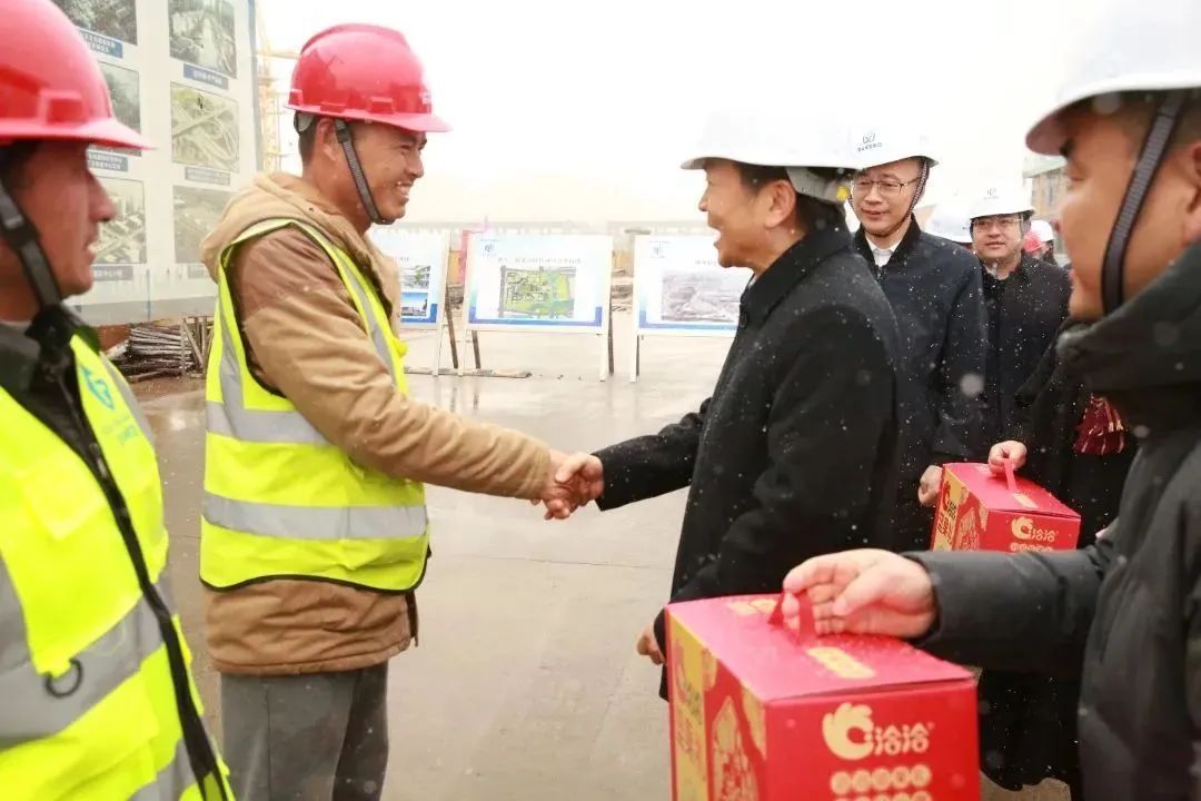 戴建平一行来到浙大二院萧山院区一期项目,详细了解了项目进展情况,并为风雪天里坚守岗位一线的职工送上了新春礼包,向他们致以节日的问候,并叮嘱他们做好防寒保暖工作,确保自身健康安全和生产作业高效安全。