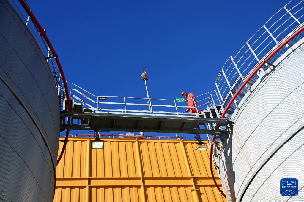 1月25日,工人在埕北油田检查储油罐。新华社记者 赵子硕 摄
