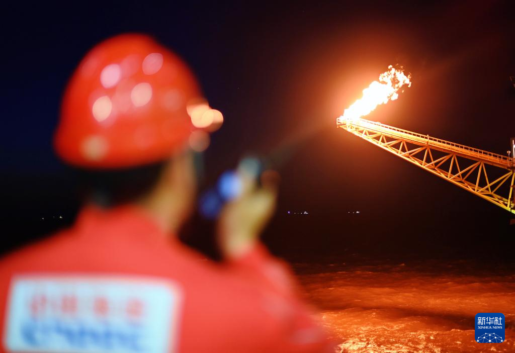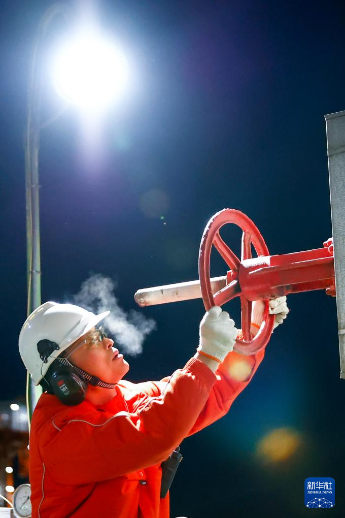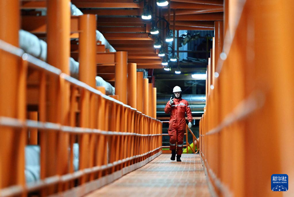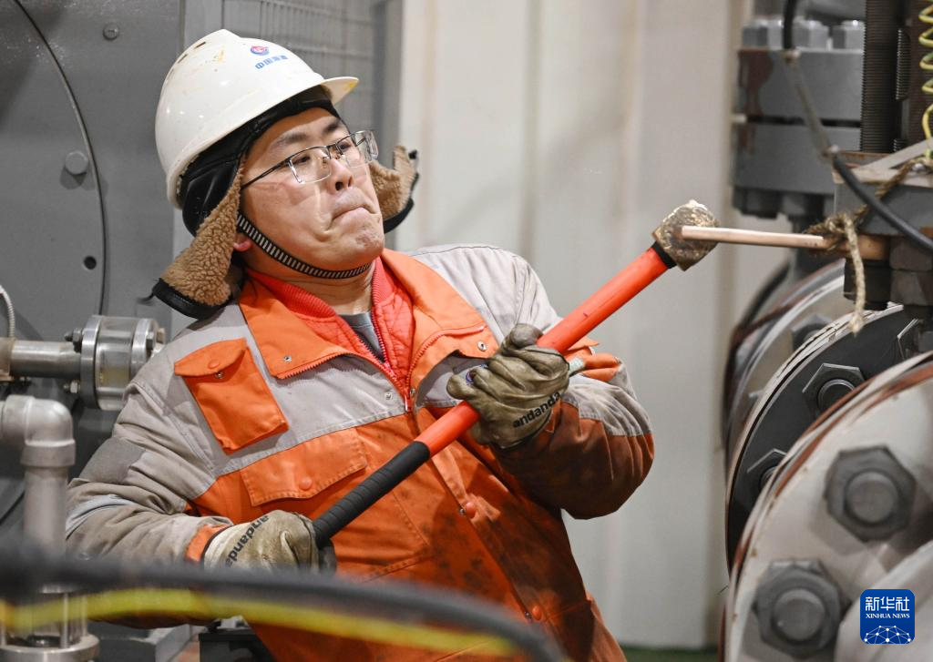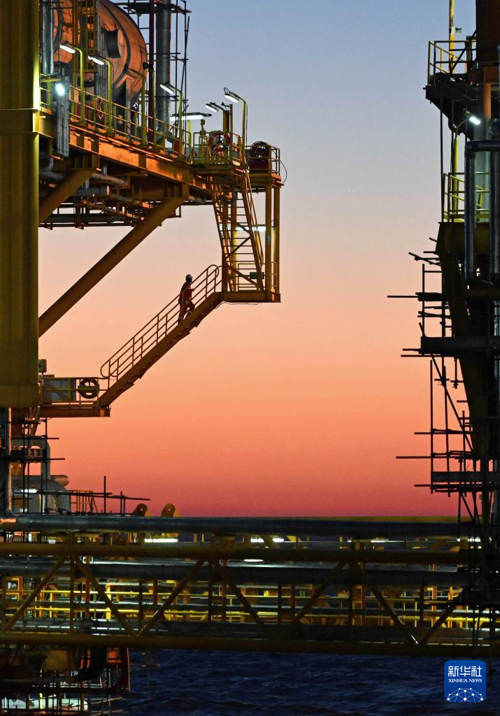 1月24日,工人在埕北油田平台作业现场进行流程调整。新华社发(杜鹏辉摄)