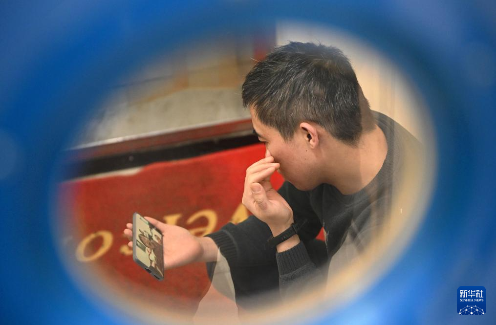 1月24日,一名工人在埕北油田平台生活楼内和家人视频通话。新华社记者 赵子硕 摄