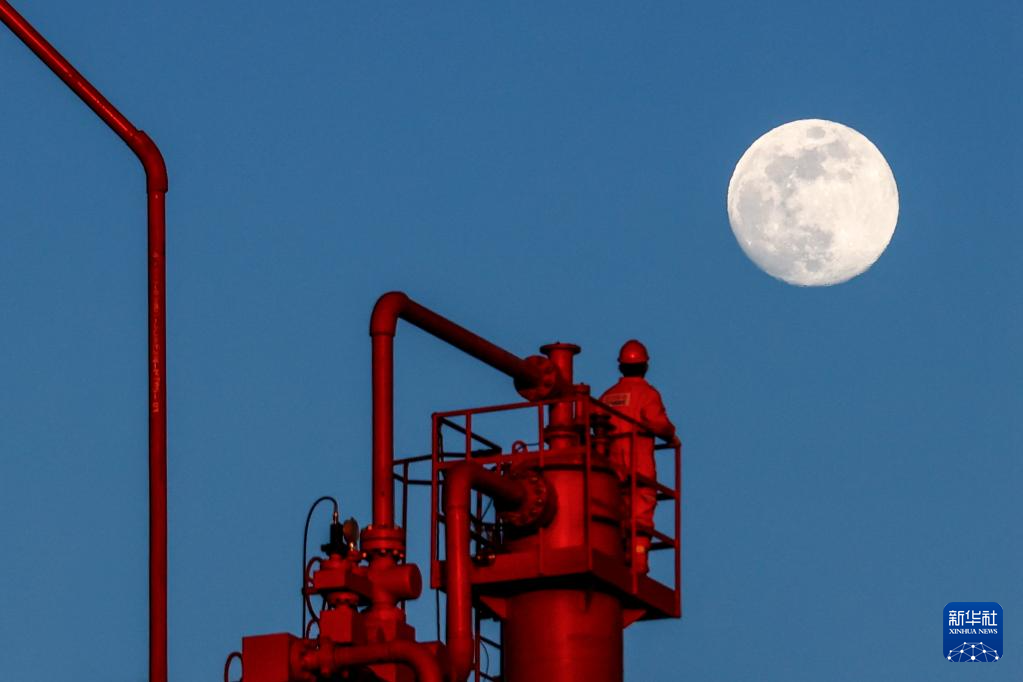 1月24日,工人在埕北油田平台欣赏升起的月亮。新华社发(杜鹏辉摄)