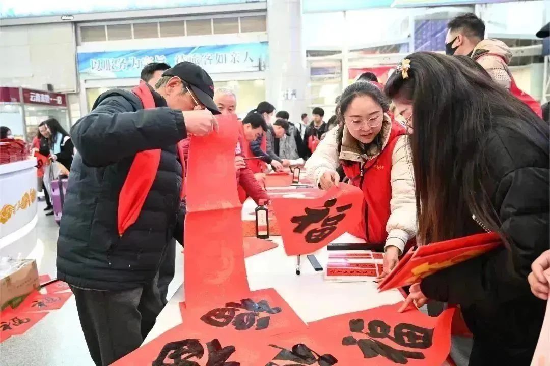 中工网讯 据云南省总工会微信公众号消息,1月26日,春运开始的第一天,昆明火车站候车厅内喜气洋洋、年味浓郁,云南省总工会开展2024年“送万福 进万家”书法公益志愿服务活动,为职工群众送上新年祝福。