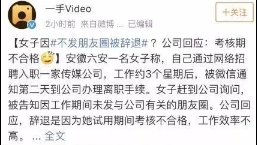■ 也有网友反映,自己入职传媒公司人事专员岗,却因工作期间未在朋友圈转发公司广告,入职半个多月被辞退。