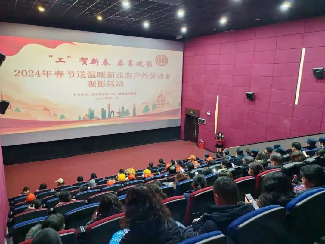 宜昌市伍家岗区总工会联合潇湘国际影城开展2024年春节送温暖新业态户外劳动者观影活动,140余名劳动模范、保安员、外卖小哥、环卫工人共同欣赏了影片《年会不能停》,观影现场,职工们笑声不断,氛围极佳。