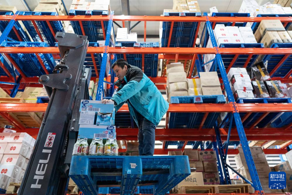1月31日,在中国(黑龙江)自由贸易试验区黑河片区,黑河跨境电商园区智能仓储物流中心的工人在搬运货物。新华社记者 谢剑飞 摄