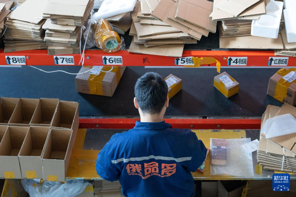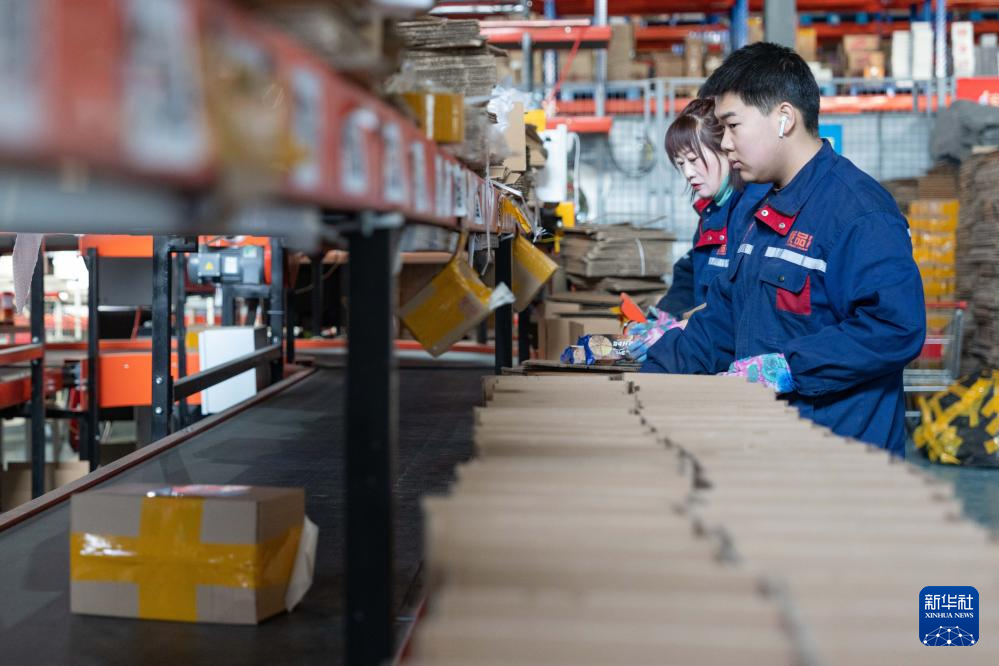 1月31日,在中国(黑龙江)自由贸易试验区黑河片区,黑河跨境电商园区智能仓储物流中心的工人把打包好的货物通过传送带送到快递分拣场。新华社记者 谢剑飞 摄