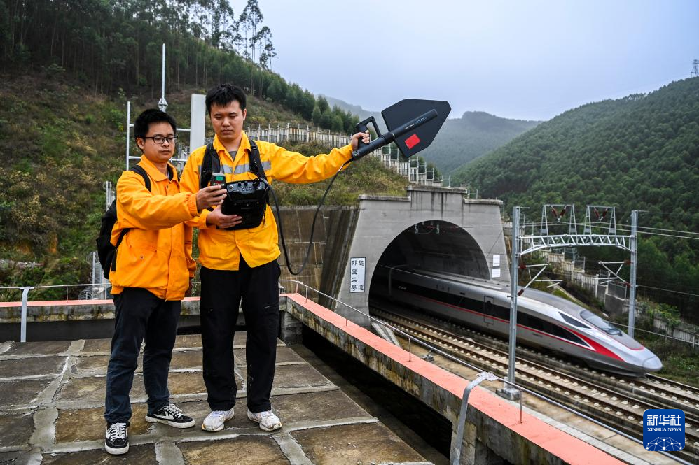 2月1日,“捕风者”何润翔(右)、覃国勇在高铁线附近寻找信号干扰源。新华社记者 曹祎铭 摄