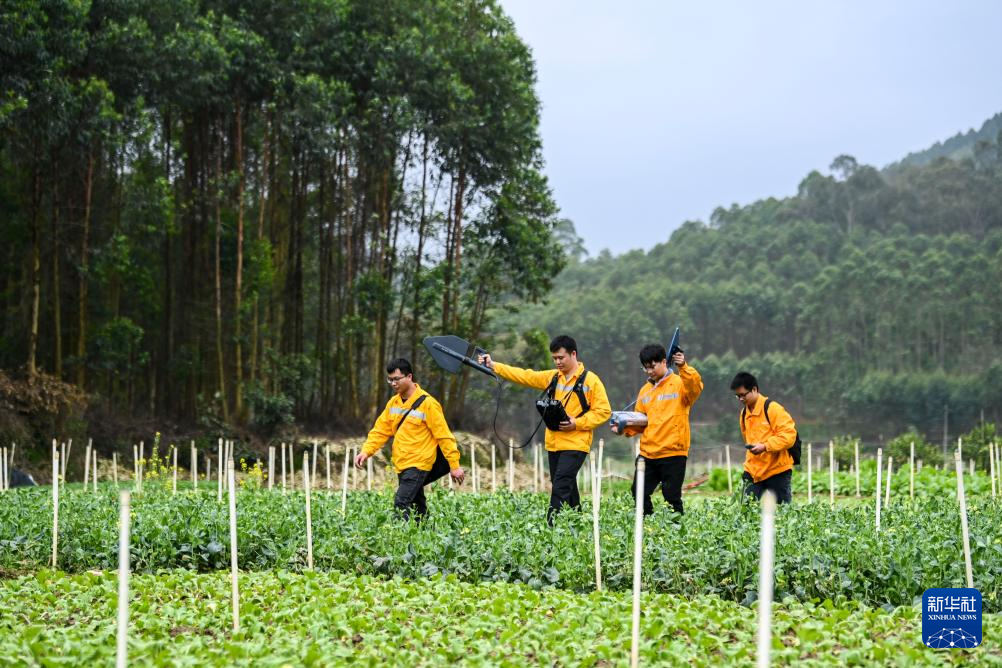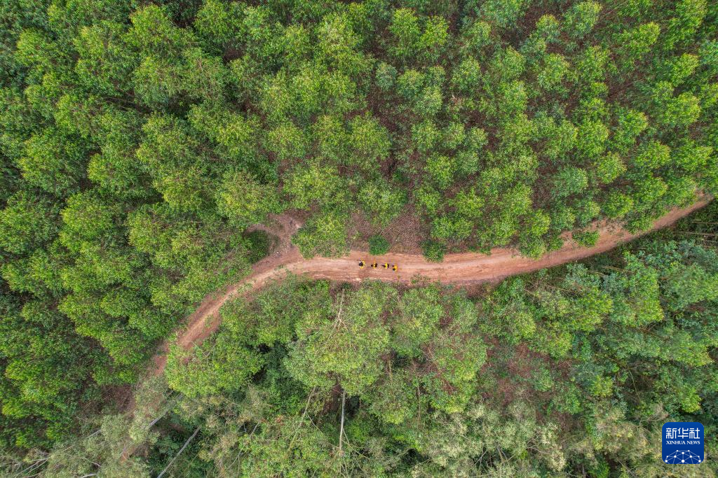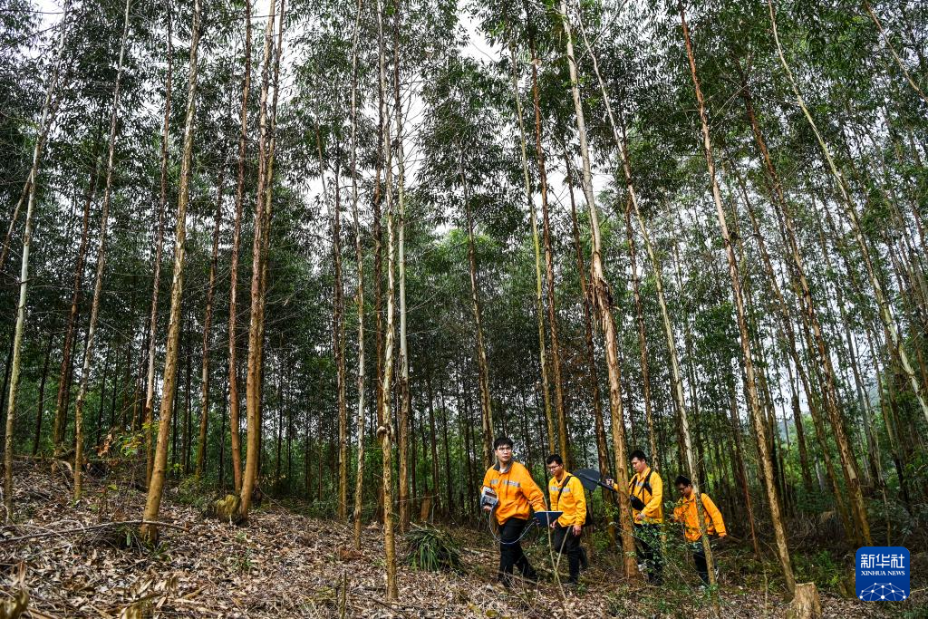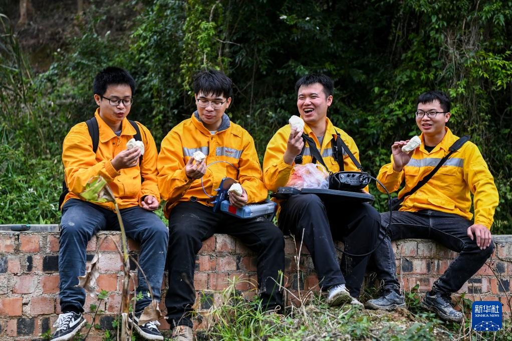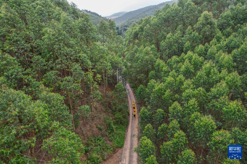 2月1日,中国铁路南宁局集团有限公司南宁通信段“捕风者”在山林中搜寻信号干扰源(无人机照片)。新华社发(蒙鑫凌摄)