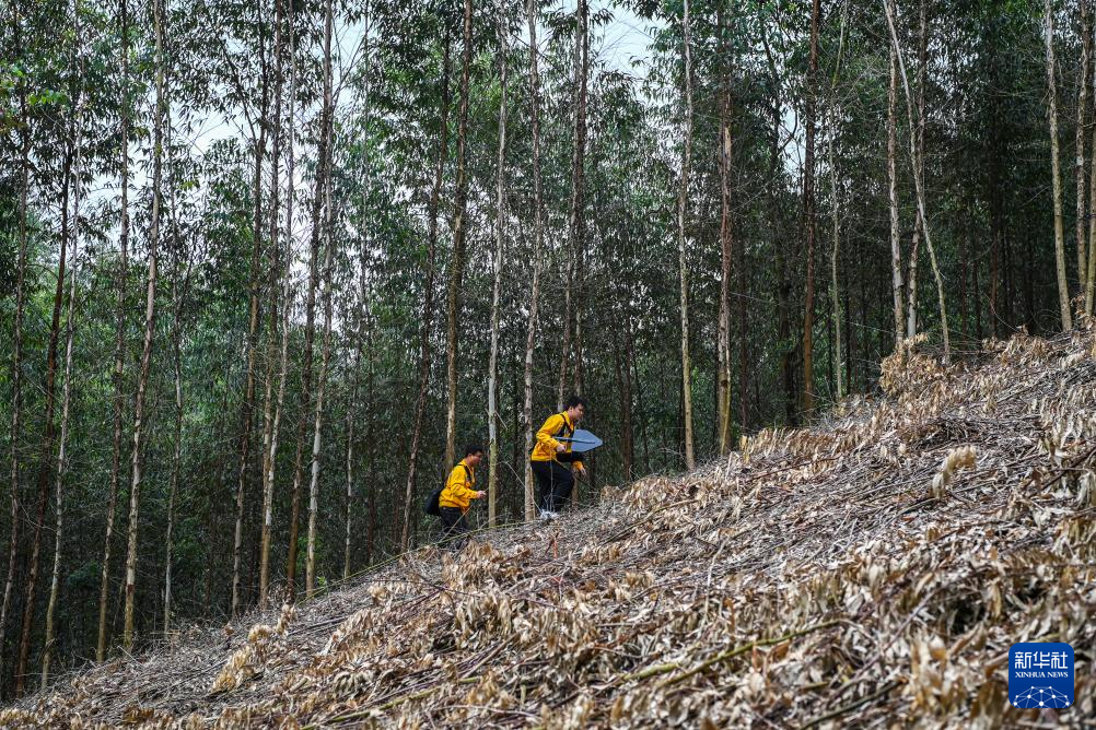2月1日,中国铁路南宁局集团有限公司南宁通信段“捕风者”在树林中搜寻信号干扰源。新华社记者 曹祎铭 摄