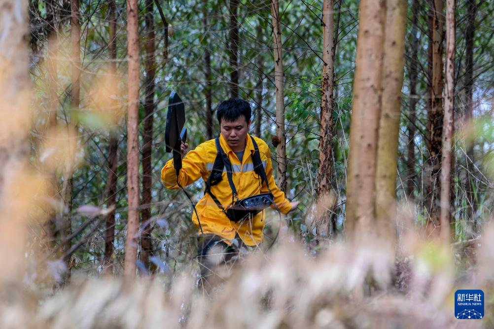 2月1日,“捕风者”何润翔在树林中搜寻信号干扰源。新华社记者 曹祎铭 摄