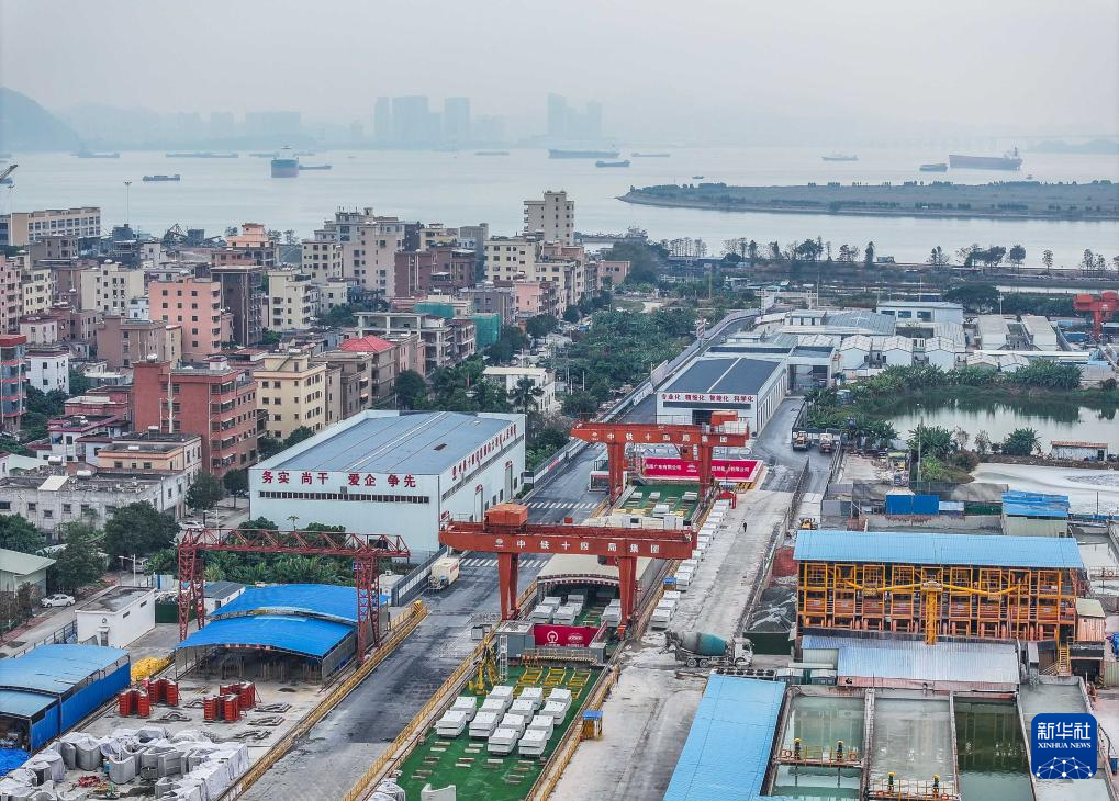 深江铁路珠江口隧道东莞虎门段盾构起点(1月29日摄,无人机照片)。深江铁路建成通车后将把深圳、东莞、广州、中山、江门这五座大湾区城市更紧密连接在一起,实现深圳前海自贸区与广州南沙自贸区半小时高铁互联互通,助力打造“轨道上的大湾区”。新华社记者 刘大伟 摄