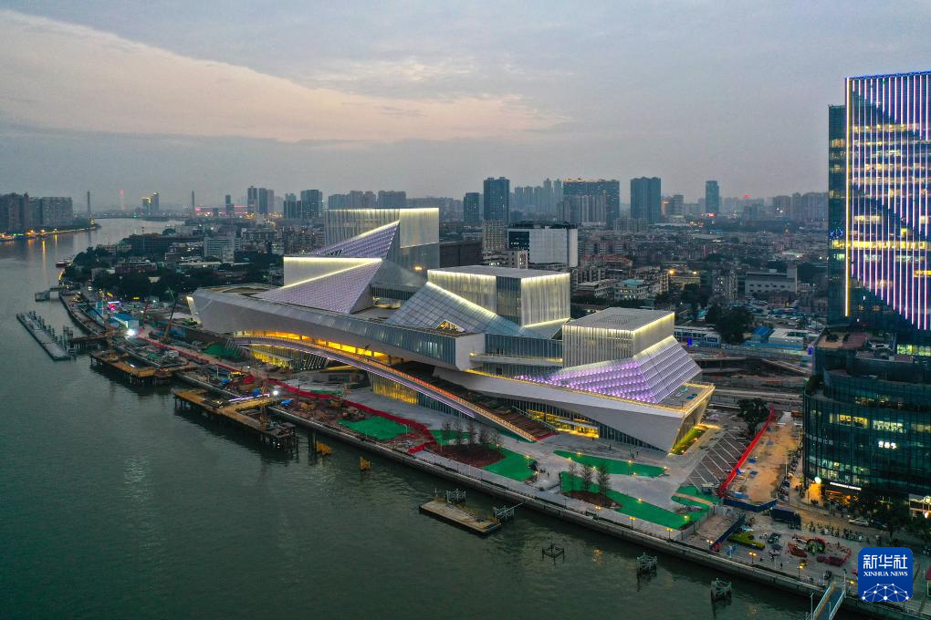 由中建三局承建的白鹅潭大湾区艺术中心进行亮灯测试(1月31日摄,无人机照片)。白鹅潭大湾区艺术中心位于广州珠江白鹅潭,该项目集广东美术馆、广东非物质文化遗产展示中心、广东文学馆“三馆合一”,目前已进入室内装修工程收尾阶段。新华社记者 刘大伟 摄