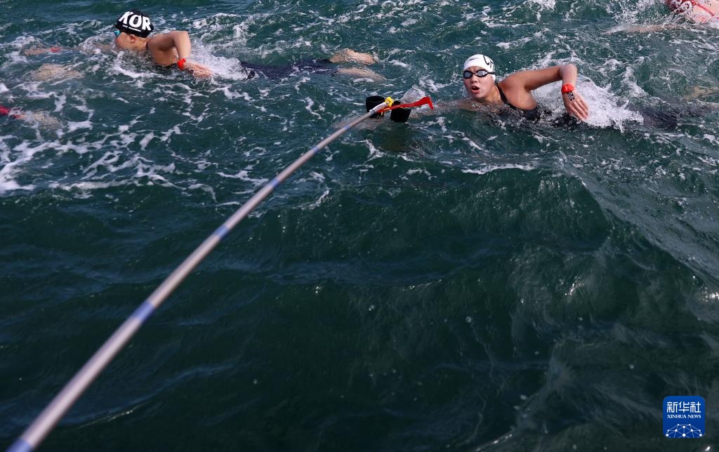 2月3日,中国选手毛奕菡(右)在比赛中游向补给点。最终她位列第40。新华社记者 雒圆 摄