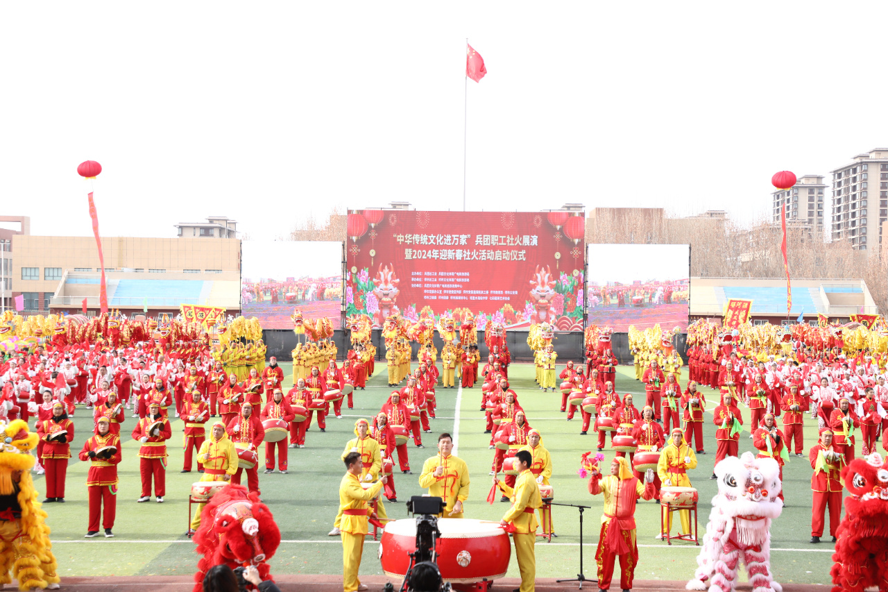 舞龙舞狮、威风锣鼓、安塞腰鼓……2月4日,由新疆生产建设兵团总工会、兵团文化体育广电和旅游局联合主办的“中华传统文化进万家”兵团职工社火展演暨2024年迎新春社火活动,在一师阿拉尔市启动。