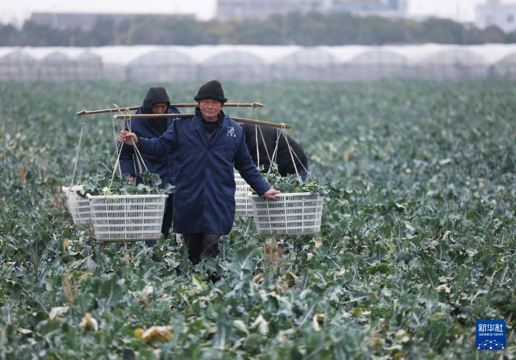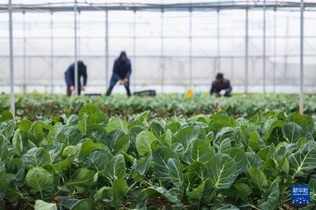 2月5日,在慈溪海通时代农业园的蔬菜大棚内,工人采收蔬菜供应节日市场。该农业公司拥有核心基地1185亩,1964平方米智能温室和14674平方米连栋大棚以及配套的标准大棚11.67万平方米,近期有西兰花、大白菜、小青菜、番茄、草莓等蔬菜水果集中上市,供应春节节日市场。