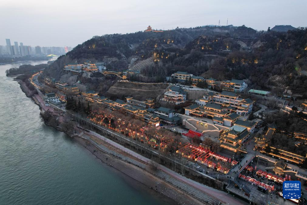 2月5日,游客在甘肃兰州的黄河市集上游玩(无人机照片)。新华社记者 马希平 摄