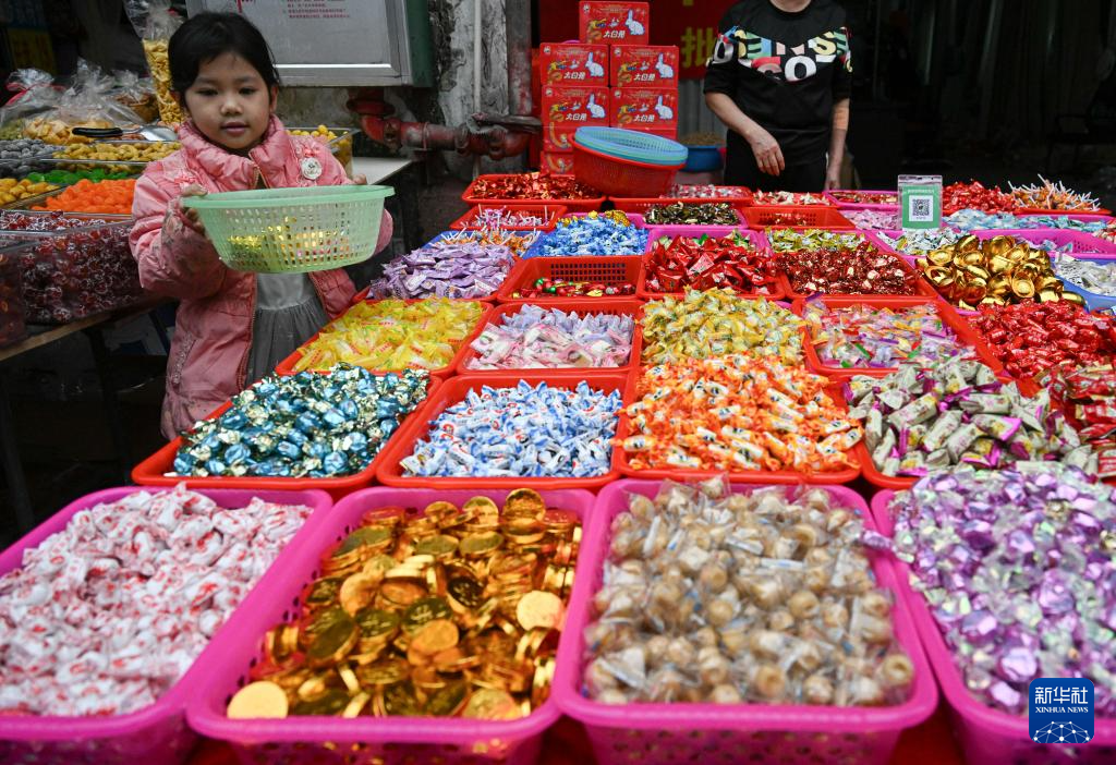 2月5日,人们在福建省龙岩市武平县十方镇“赴圩”现场购买糖果零食。十方镇是客家人相对集中的乡镇,客家人称“赶集”为“赴圩”。新华社记者 周义 摄