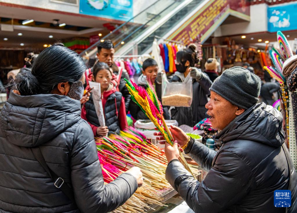 2月6日,在拉萨市城关区八廓商城的年货市场里,顾客在选购五彩青稞穗。新华社记者 孙瑞博 摄