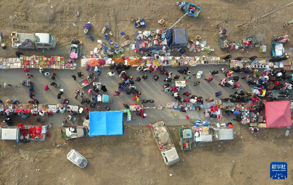 2月6日在山东省临邑县临南镇拍摄的一处农村大集(无人机照片)。新华社记者 徐速绘 摄