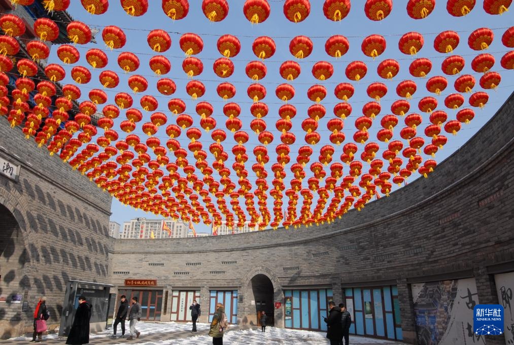 2月6日,游客在山东省青岛市即墨古城大红灯笼下观赏游玩。