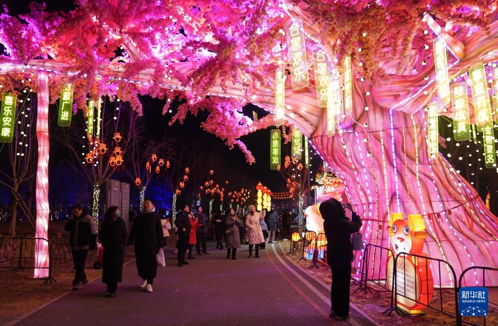 2月5日,游客在北京温榆河公园观灯赏景。