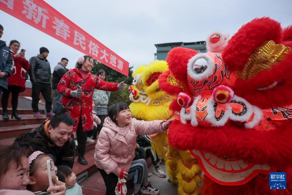 2月5日,在四川省遂宁市蓬溪县蓬南镇新春民俗大巡游活动现场,民间艺人表演舞狮并与小朋友互动。