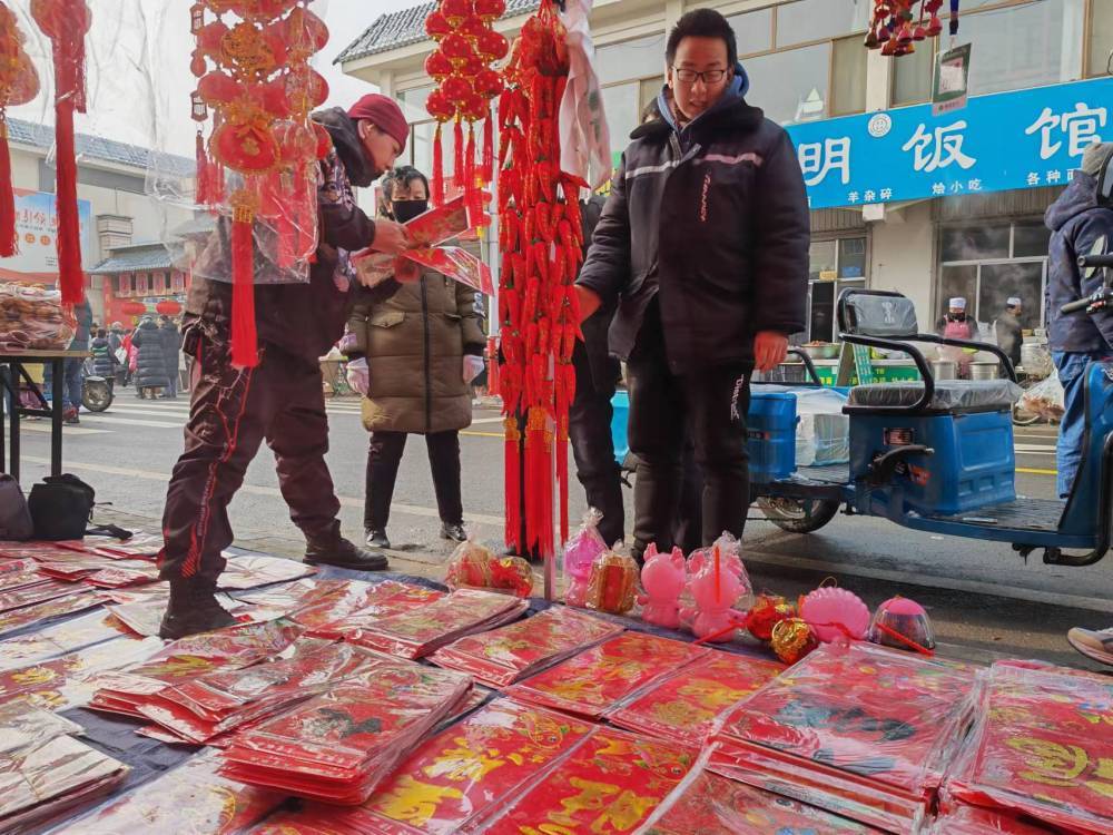 “每年小年一过,这大集是越赶越红火。贴春联是传统年俗,家家户户都要买。”田仕鹏说着,为自家也选定了一副:万事如意财运来,新春大吉福门开。“新的一年,求财、求运、求福。”他笑道。出摊一上午,这位42岁的摊主在收付款到账声中忙得不亦乐乎。