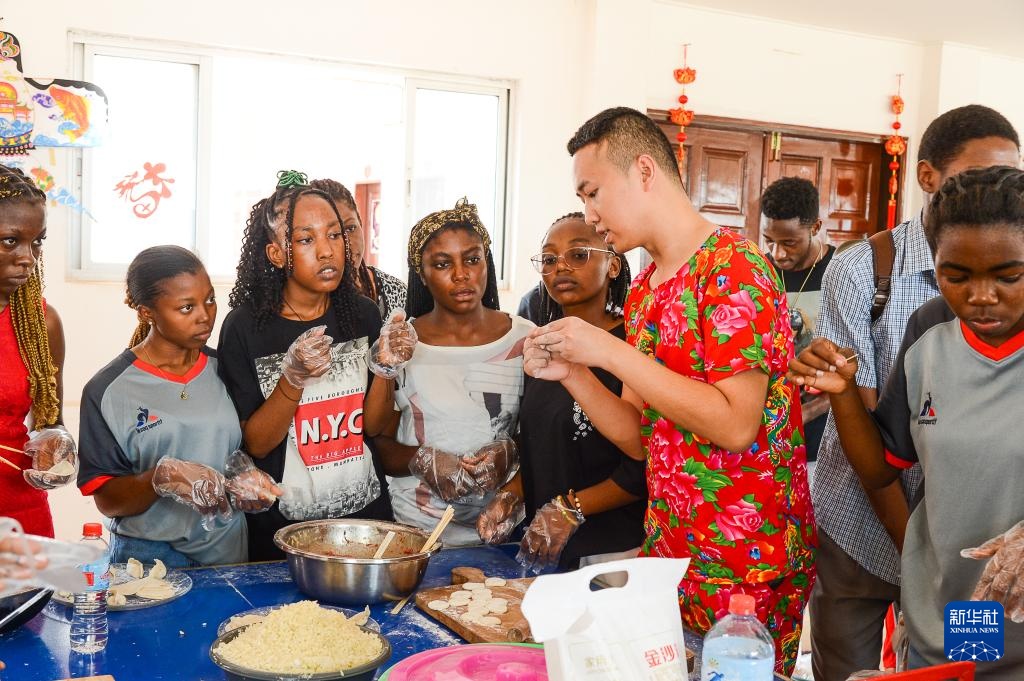 2月8日,在喀麦隆雅温得,学生学习包饺子。