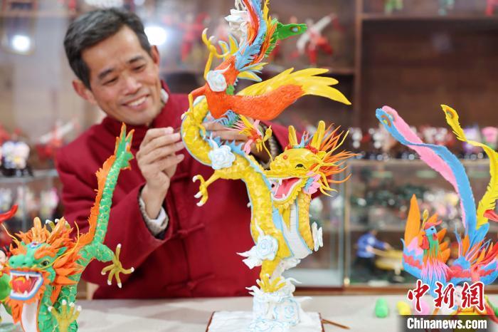 农历新年临近,临沂市沂南县红石寨非物质文化遗产博物馆的面塑艺人左安胜创作出“龙凤呈祥”迎新年面塑作品,栩栩如生,喜迎新年到来。王彦冰 摄