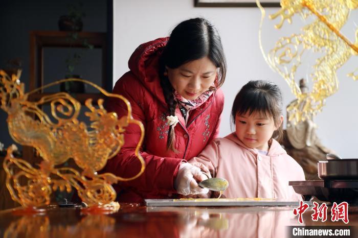 农历龙年前夕,泰安市宁阳县李氏糖画非遗传承人李然然在传统平面糖画制造的基础上,创新性塑造立体“龙龘龘”。陈阳 摄