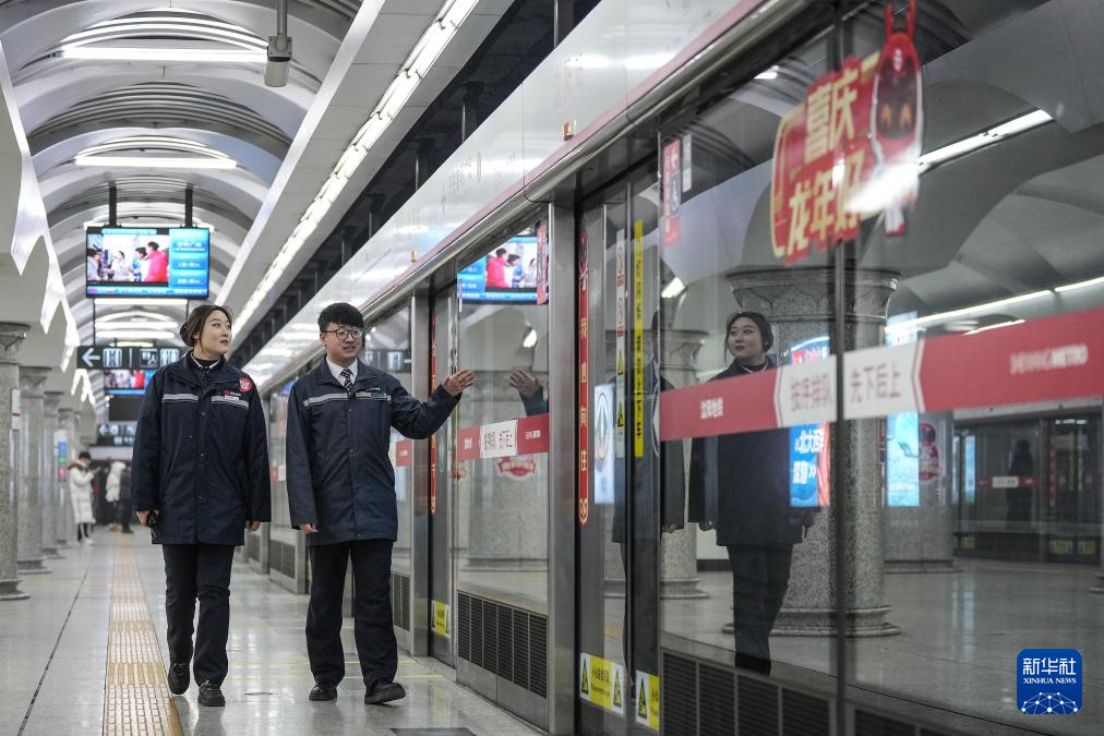 2月9日,孙雷在“沈阳站站”站台与工作人员一起巡查。新华社记者 潘昱龙 摄