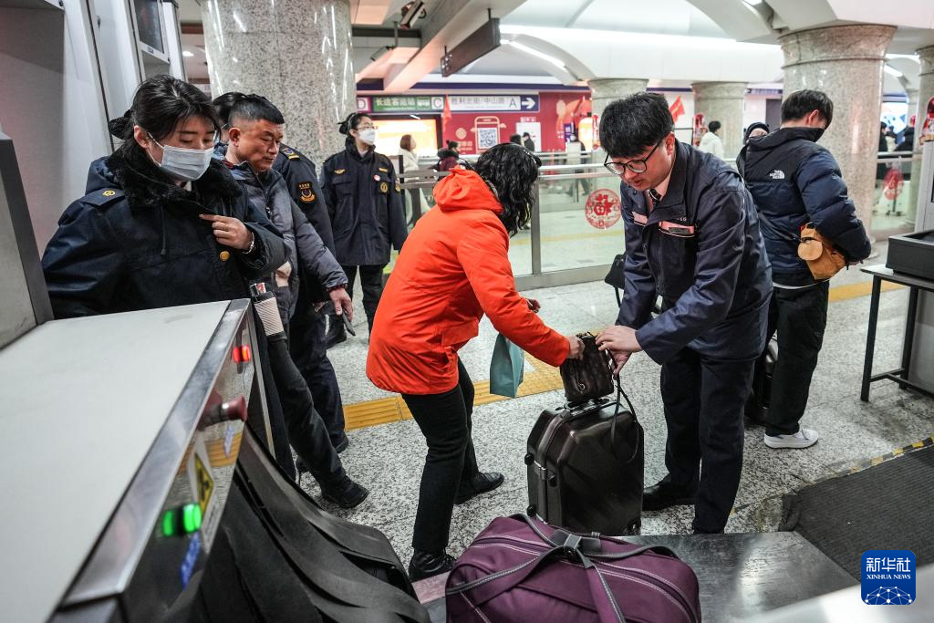 2月9日,孙雷在“沈阳站站”站内的安检处协助乘客进站。新华社记者 潘昱龙 摄